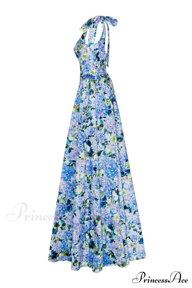 La robe longue à bretelles nouées Blue Hydrangea est confectionnée en taffetas. Elle est composée d'une jupe longue ample, d'un corsage ajusté avec bretelles à nœud et d'une fermeture à lacets. Elle arbore un imprimé floral bleu.