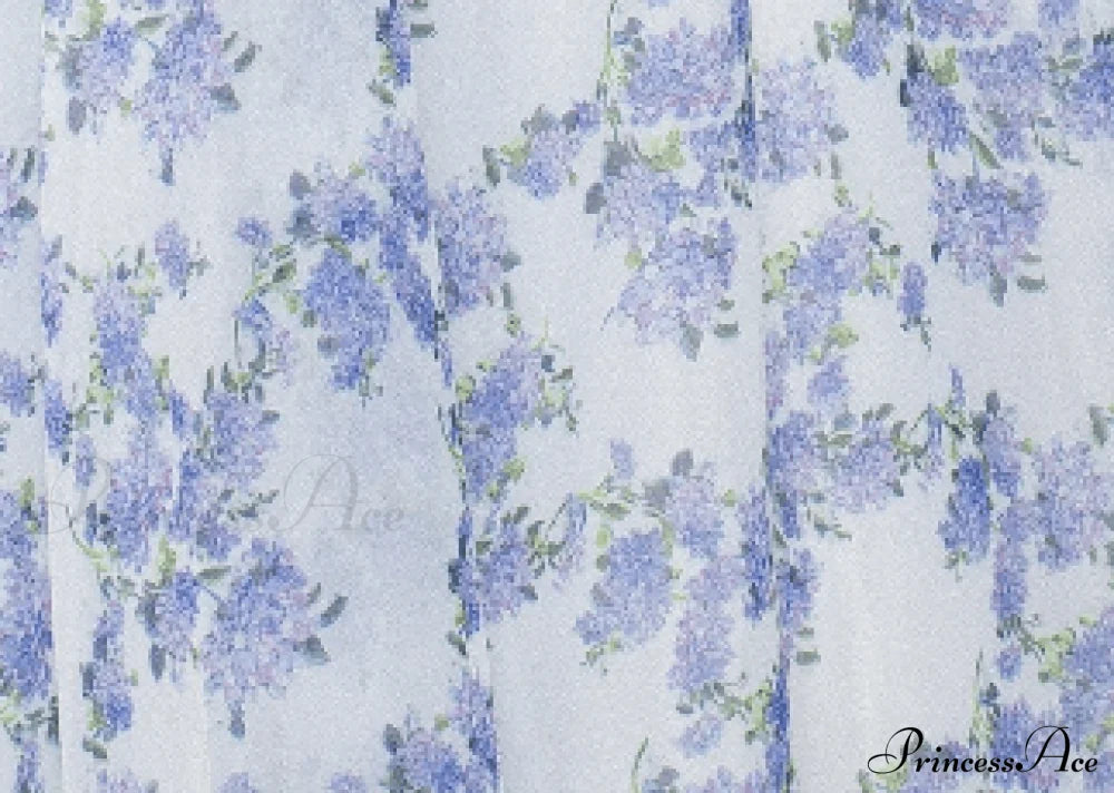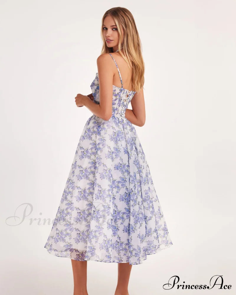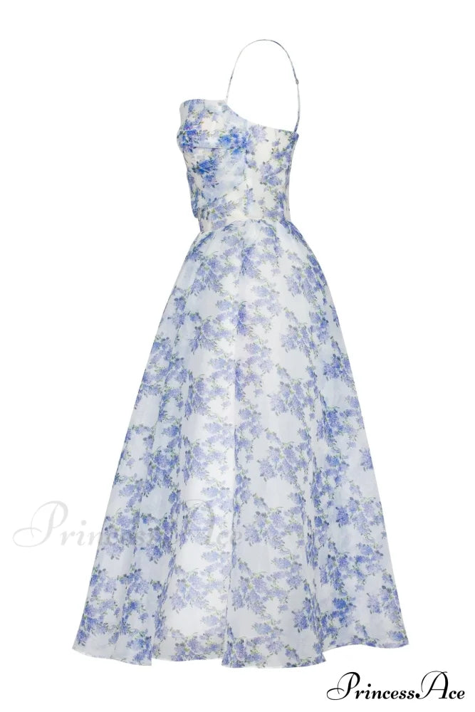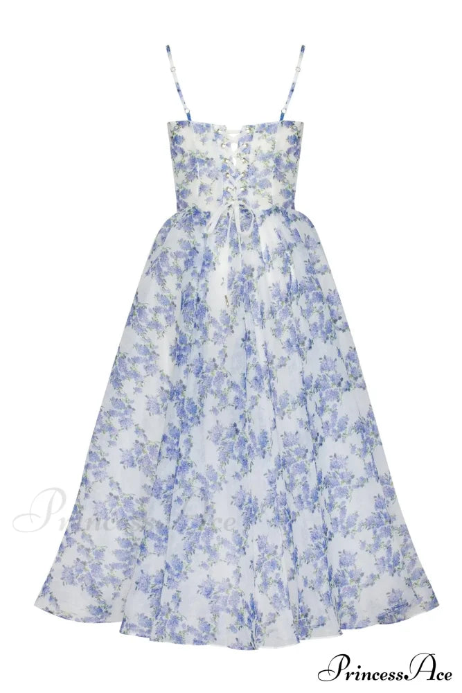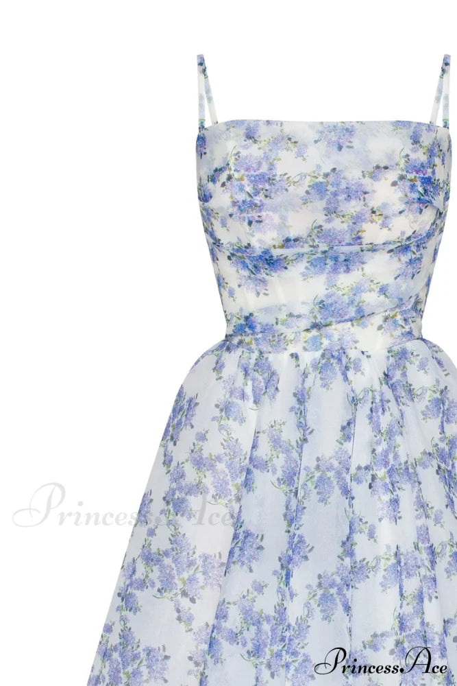 Robe à fines bretelles et jupe bouffante mi-longue. Elle présente une jupe évasée et un corsage ajusté froncé avec dentelle au dos. Elle arbore un imprimé floral bleu pastel.