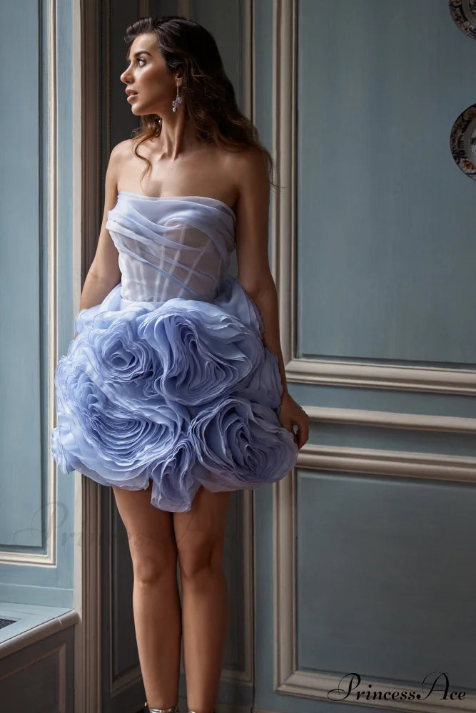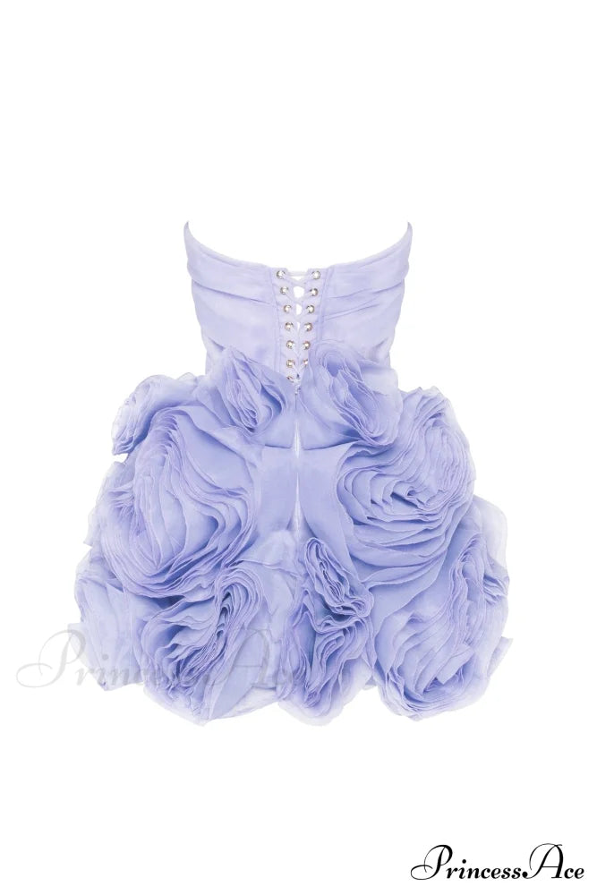 Robe courte lavande en organza brillant, ornée de grandes roses en organza appliquées sur la jupe. Elle présente un corsage semi-transparent orné de tulle à l'encolure et d'une fermeture à lacets.
