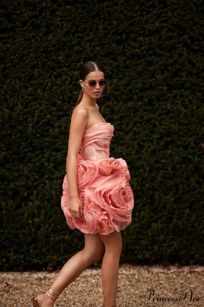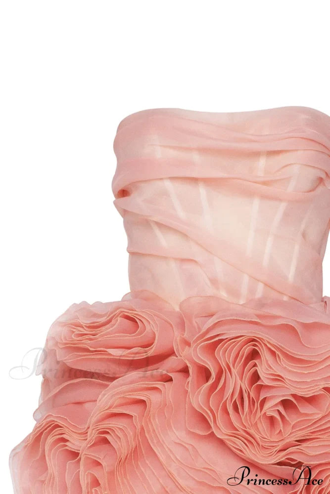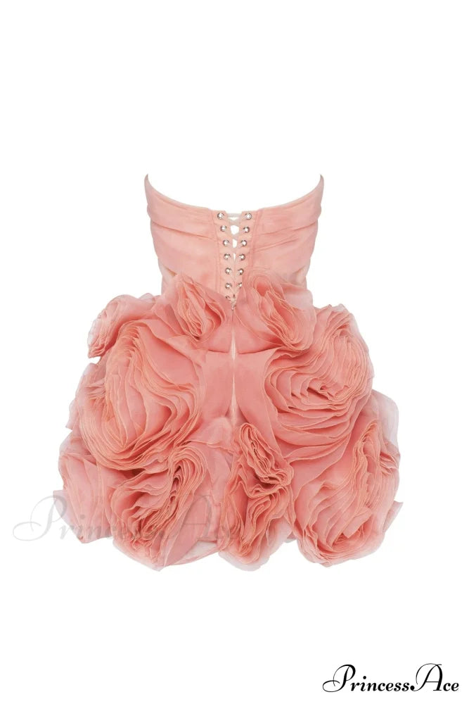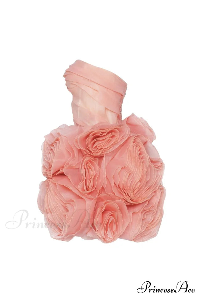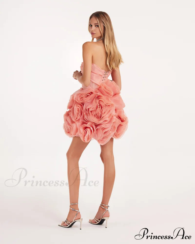 Robe courte corail en organza brillant, ornée de grandes roses en organza appliquées sur la jupe. Son corsage semi-transparent est orné de tulle à l'encolure et d'une fermeture à lacets.