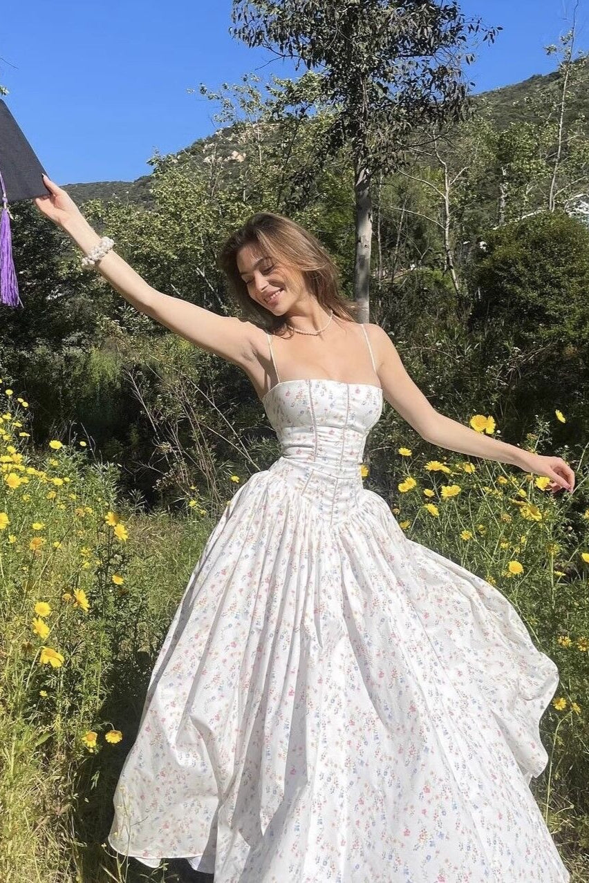 Floral Ruffle Big Hem Spaghetti Strap Waisted Maxi Dress