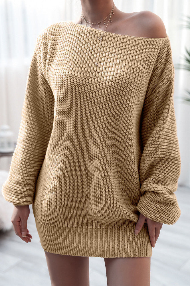 Ribbed Knit Boat Neck Long Sleeve Loose Mini Dress