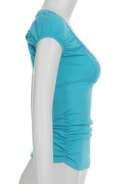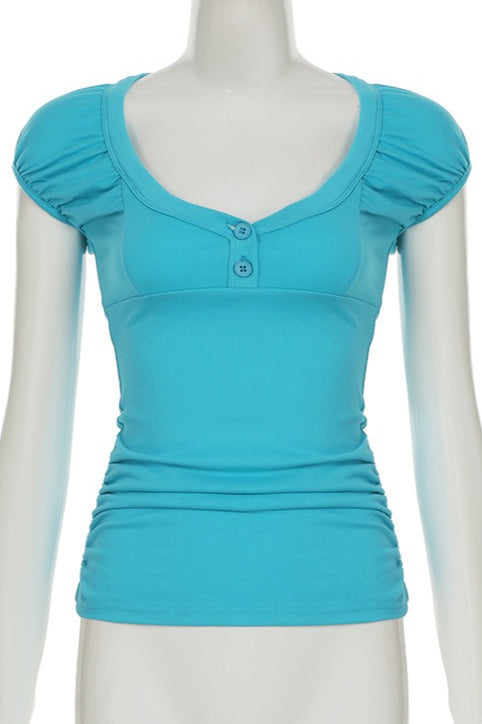 Buttoned Puff Sleeve U Neck Slim Blouse