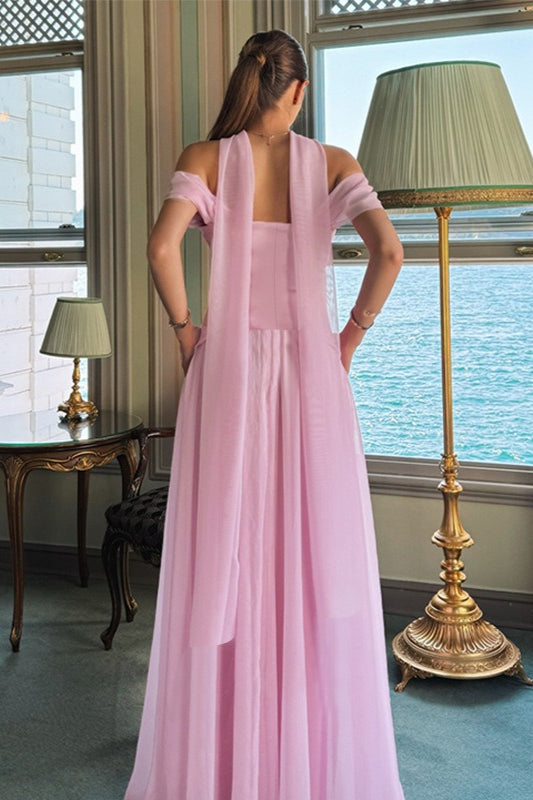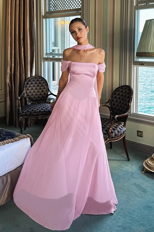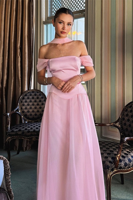 Elegant Satin Mesh Off Shoulder Prom Dress