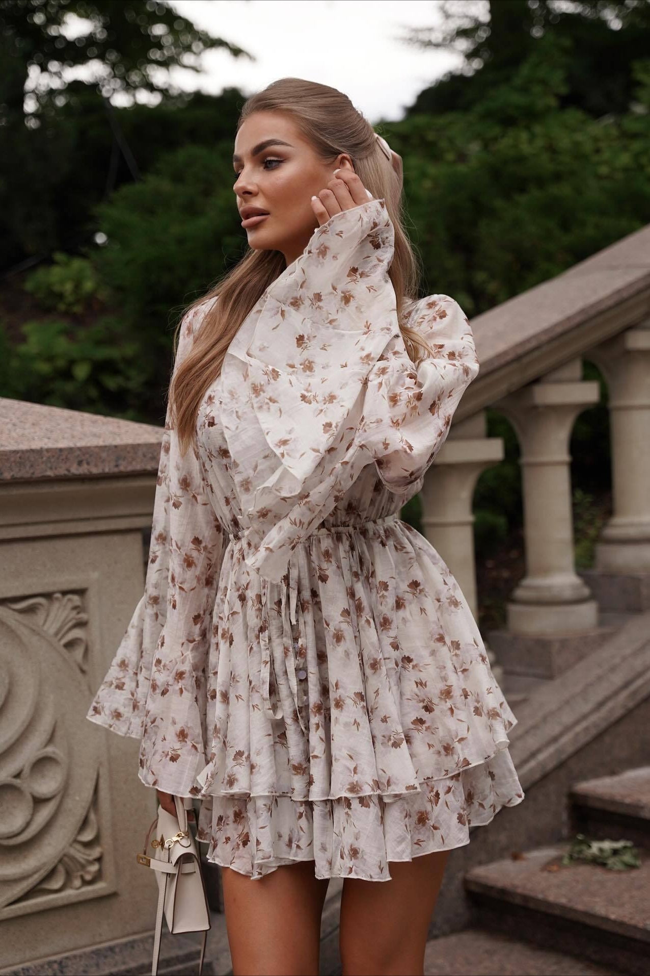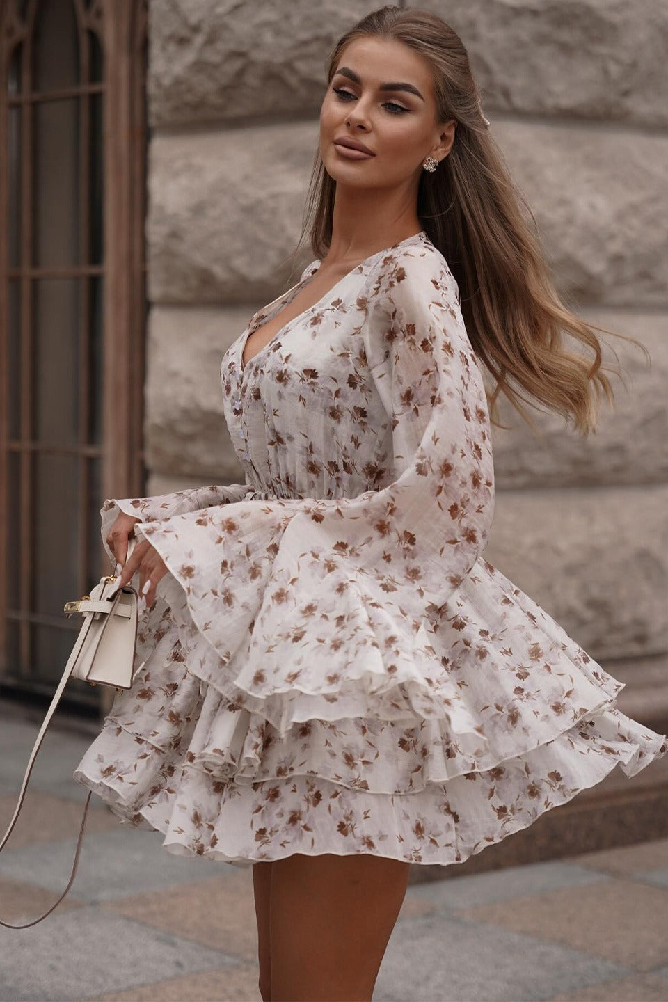 French Floral V-Neck Ruffled Mini Dress