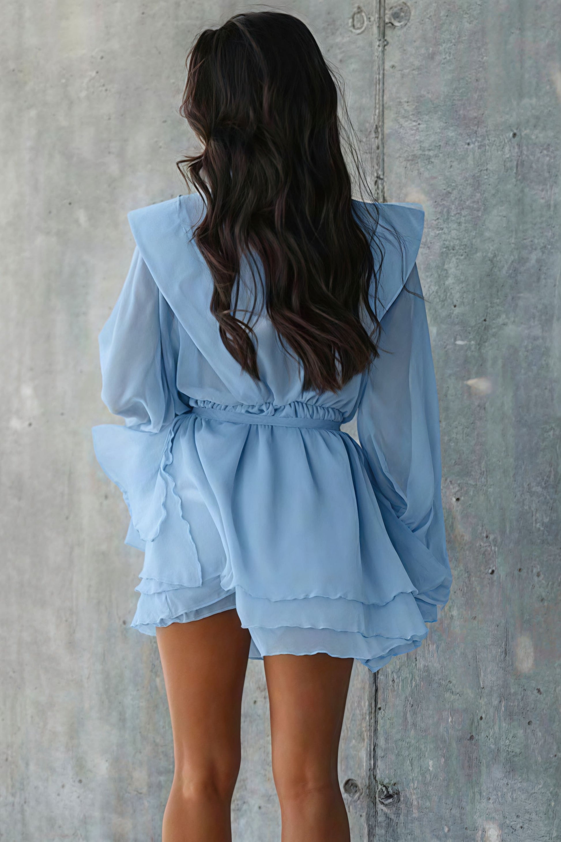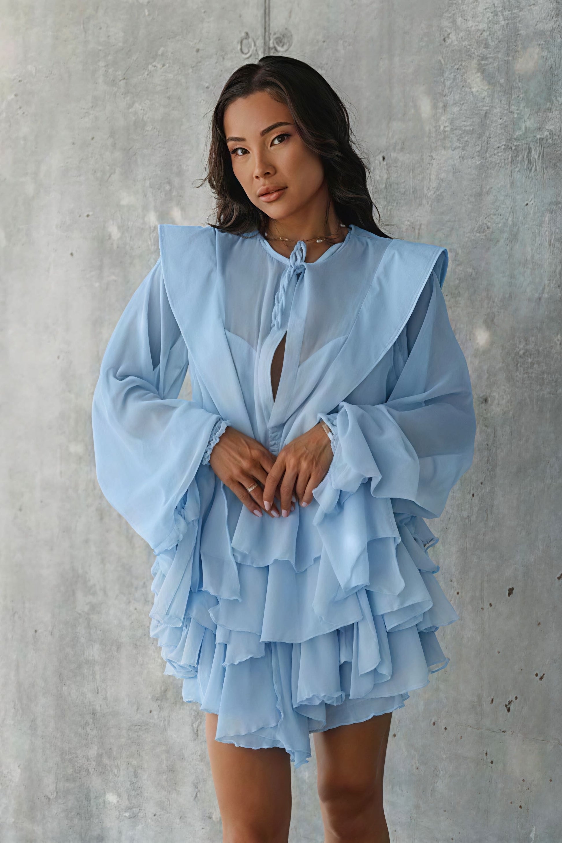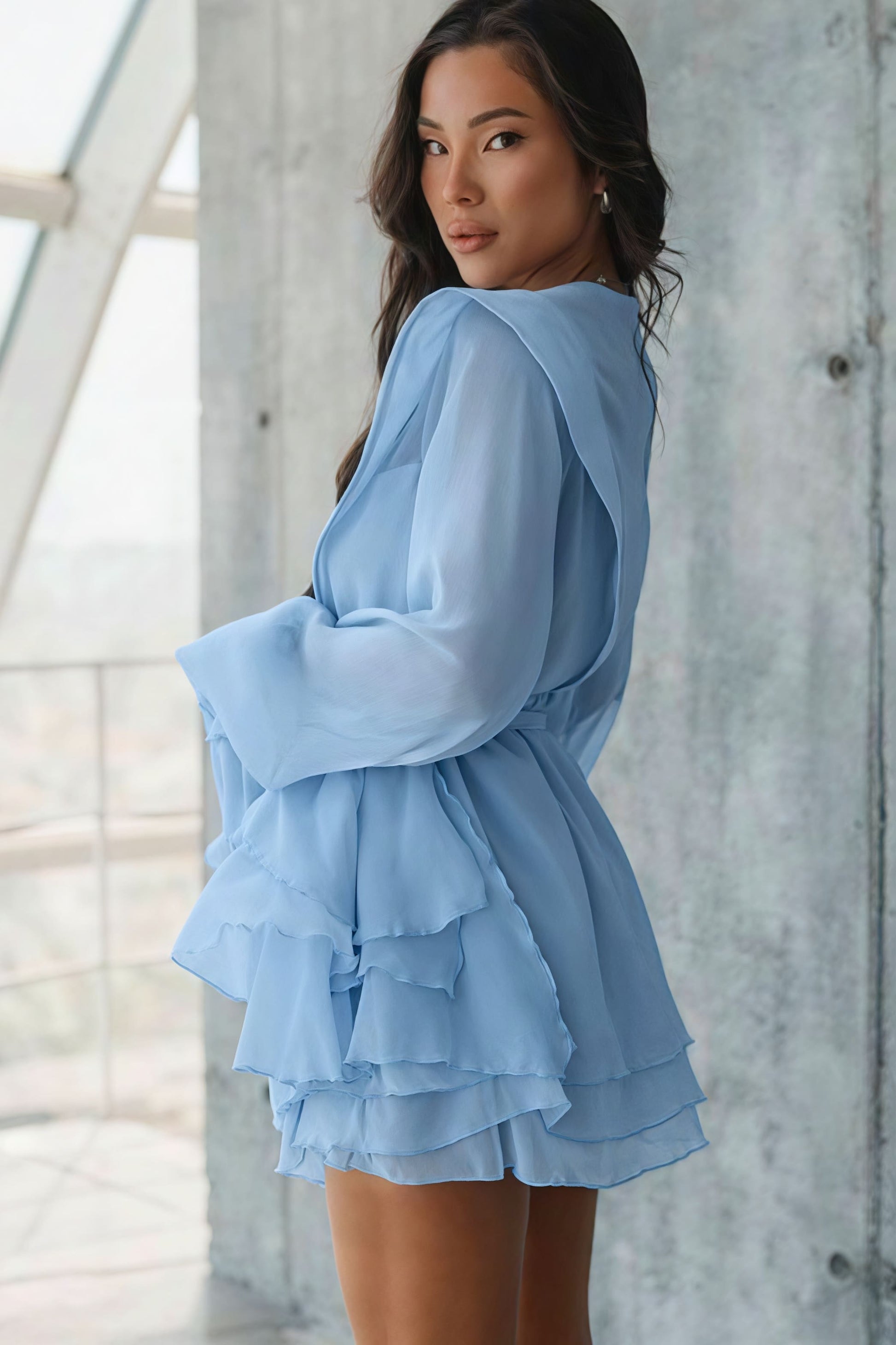 Long Sleeve Tie Mesh Sheer Tiered Mini Dress