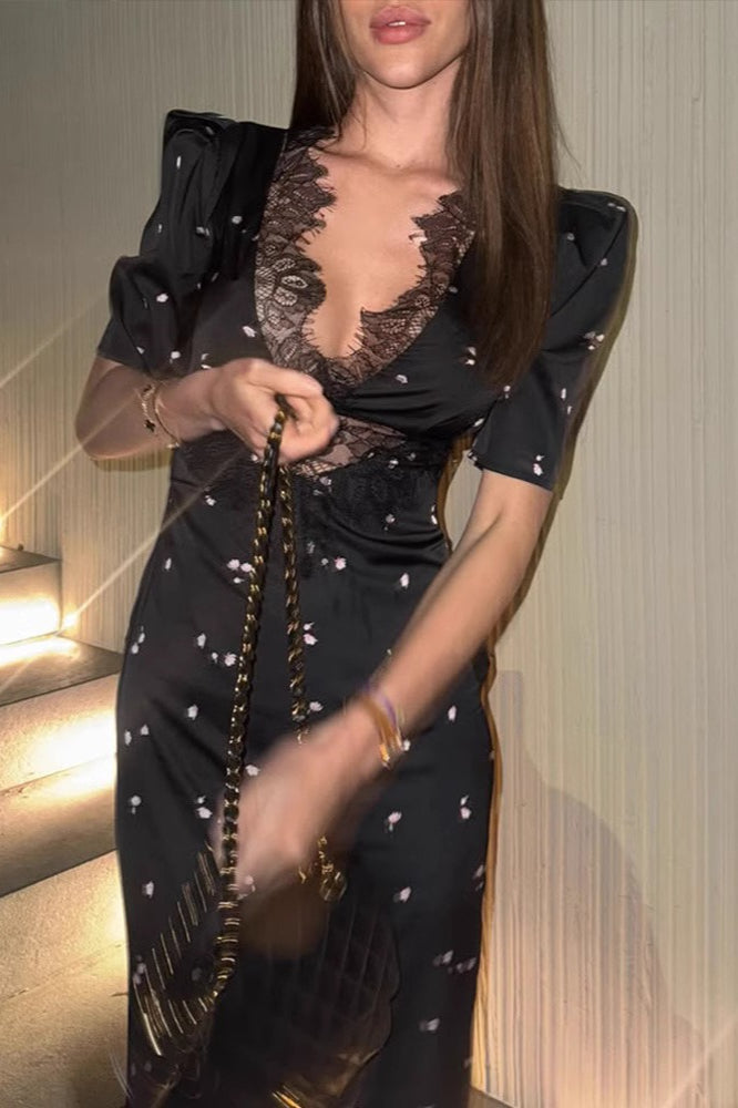 Satin Lace V Neck Cutout Polka Dot Half Sleeve Maxi Dress