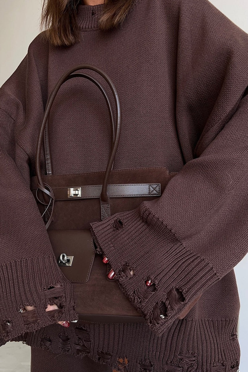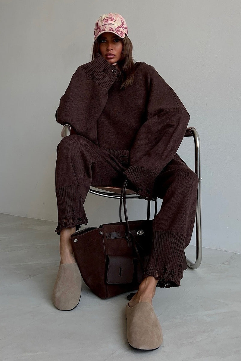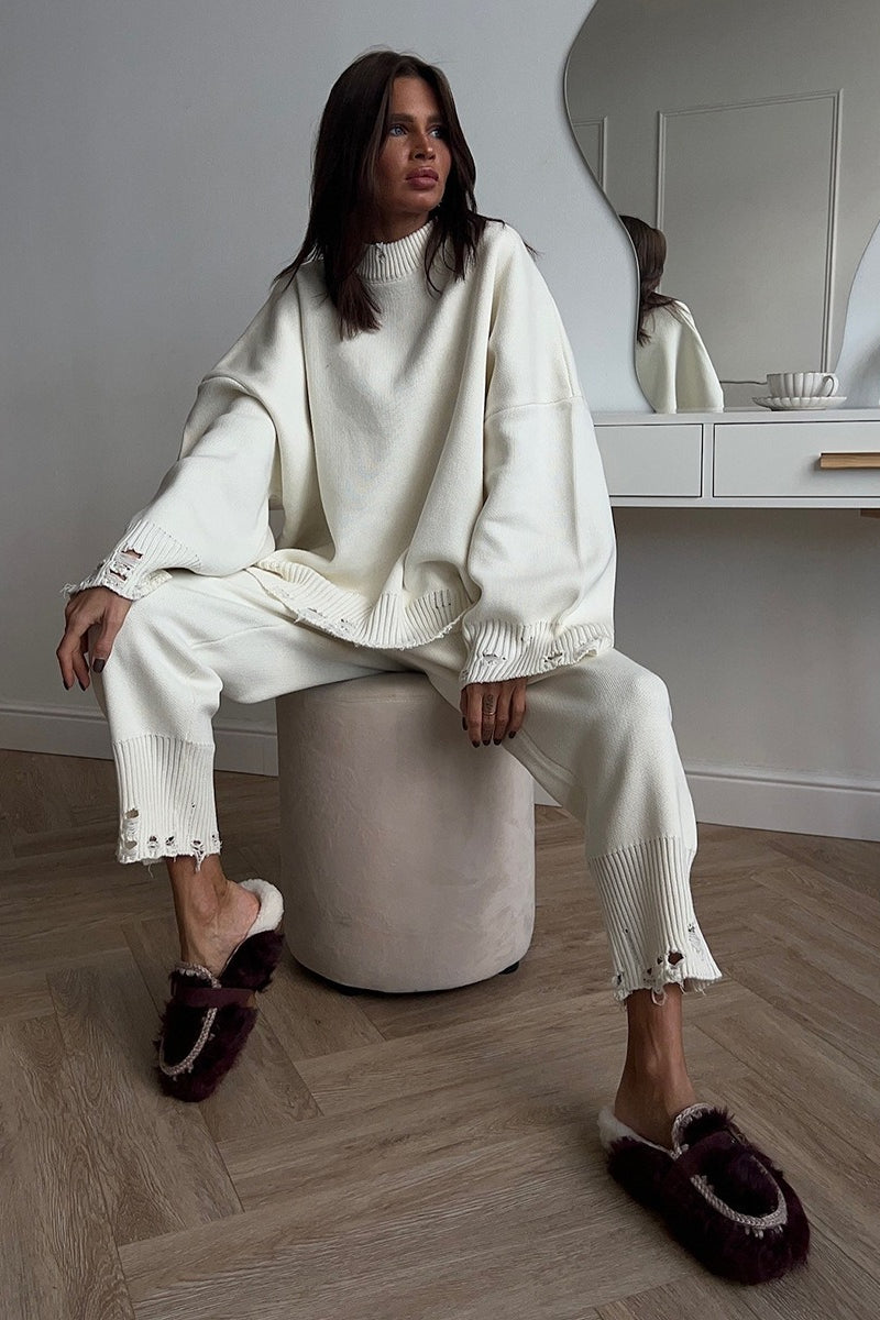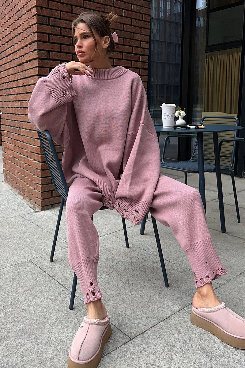 Solid Distressed Knit Crew Neck Sweater Two Piece Set