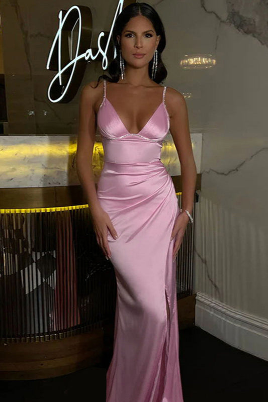 Robe de soirée ajustée fendue à bretelles en chaîne scintillante